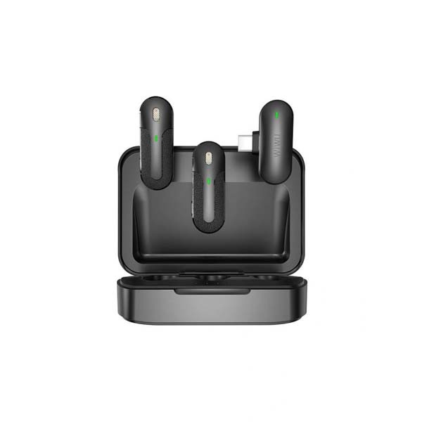 Dual-mic WiWU WM002 portable for smartphones Type-C and iOS ANC Mute Mini Wireless Microphone. Designed for a live performance, video recording, vlog, etc., it comes with a charging case and two microphones for a 30-meter connection range. The color black USB C/Lightning connection port 450mAh ABS battery material Rate: 20 Hz–20 KHz+ Transfer duration: 25 ms Plug and play without the need for an app,